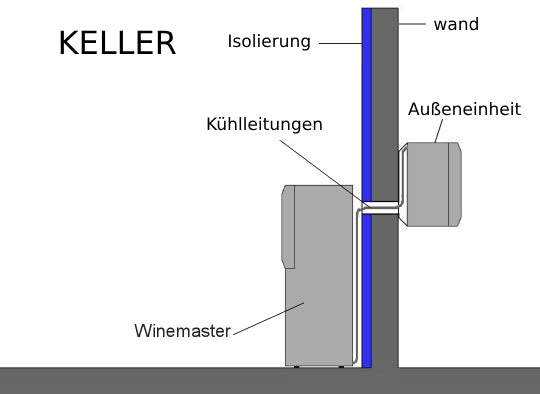 Die SP100 ist eine leistungsstarke Klimaanlage für größere Weinkeller, aber auch für kleinere, schlecht isolierte Weinkeller, bei denen das authentische Erscheinungsbild nicht beeinträchtigt werden soll. Das Gerät kann sowohl kühlen als auch heizen und ist daher sehr vielseitig einsetzbar. Die gesamte Installation besteht aus einer Innen- und einer Außeneinheit, daher der Begriff "Split-Level", die über ein 4,5 oder 8 Meter langes (vorbefülltes) Rohrleitungspaket miteinander verbunden sind. Die Innenunit wird im Keller installiert, die Außeneinheit an der Außenwand. Die Installation ist genauso einfach wie bei allen Winemaster-Geräten und kann selbst durchgeführt werden. Für fachkundige Beratung können Sie uns jederzeit anrufen.